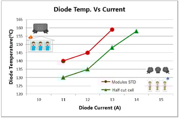 Otra de las mejoras de los módulos de celdas de medio corte, ha sido separar los diodos de By-pass, de la misma caja (J-box) que habitualmente tienen los módulos tradicionales. con esto se consigue disminuir la temperatura, dentro de la mismas cajas separadas (mini J-box) hasta 10°C. Además al estar dividida conduce a una metalización menor que un panel estándar y crea una menor resistencia interna que ahorra espacio. El espacio ahorrado como resultado de esta configuración ayuda a crear más espacio entre las celdas, lo que aumenta la reflexión interna de la luz desde la lámina posterior hacia la superficie de la celda, lo que aumenta la eficiencia del panel.